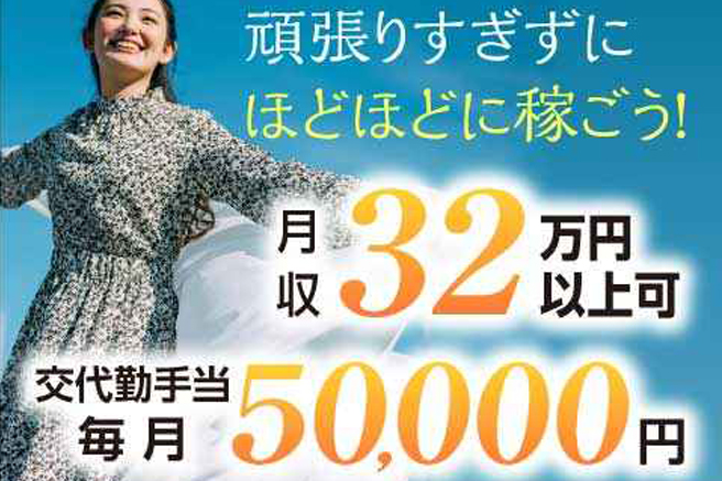 【時給】1,450円 ~ 1,813円 賃金は毎月末締め→翌月15日支払い 週払いOK(規定あり) 【月収例】【月収33万円以上可能】 ■基本給243,600円 (時給1,450円×1日8h×月21日) ■残業手当18,125 (残業時給1,813円×10h) ■深夜手当21,750円 (363円×60h) ■交代勤手当50,000円 =月収333,475円 交通費規定内支給 ※日勤のみもあり(その場合交代勤手当なし) |