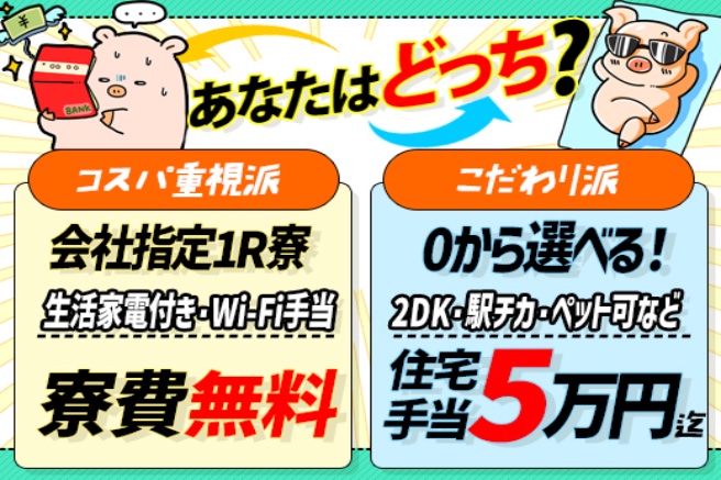 ※寮費無料(家電付き・Wi-Fi手当半年支給)